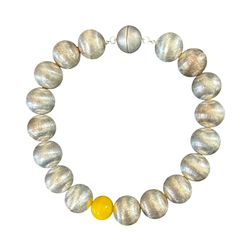 Vintage silver beads with one vintage yellow bead created into a modern necklace. Or magnetic clasp. 17 inches in length. Only one created.